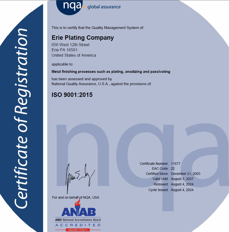 Erie Plating Company is certified to the ISO 9001:2015 quality management standards.