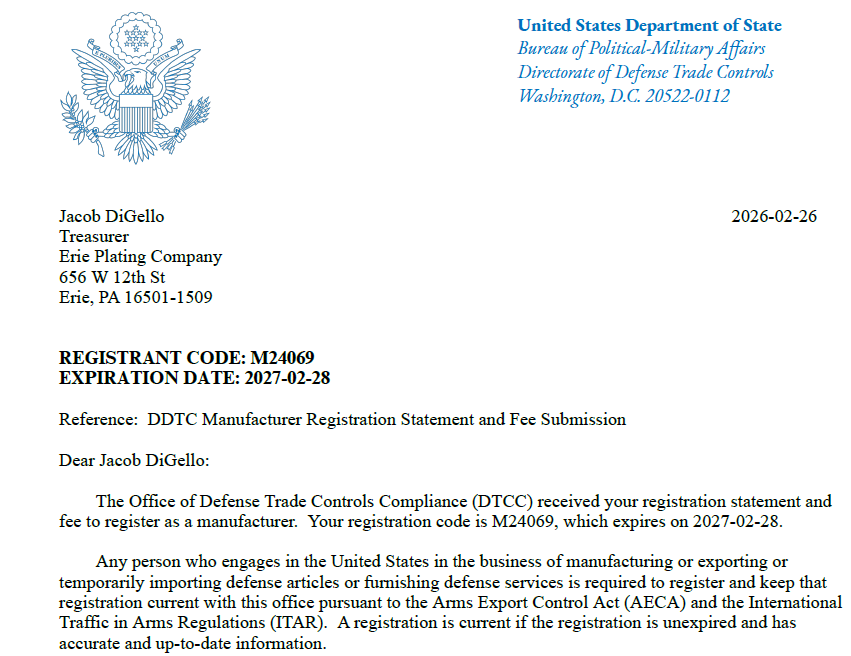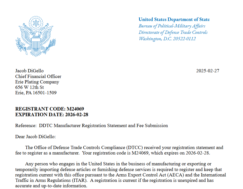 Erie Plating's ITAR registration code is M24069.